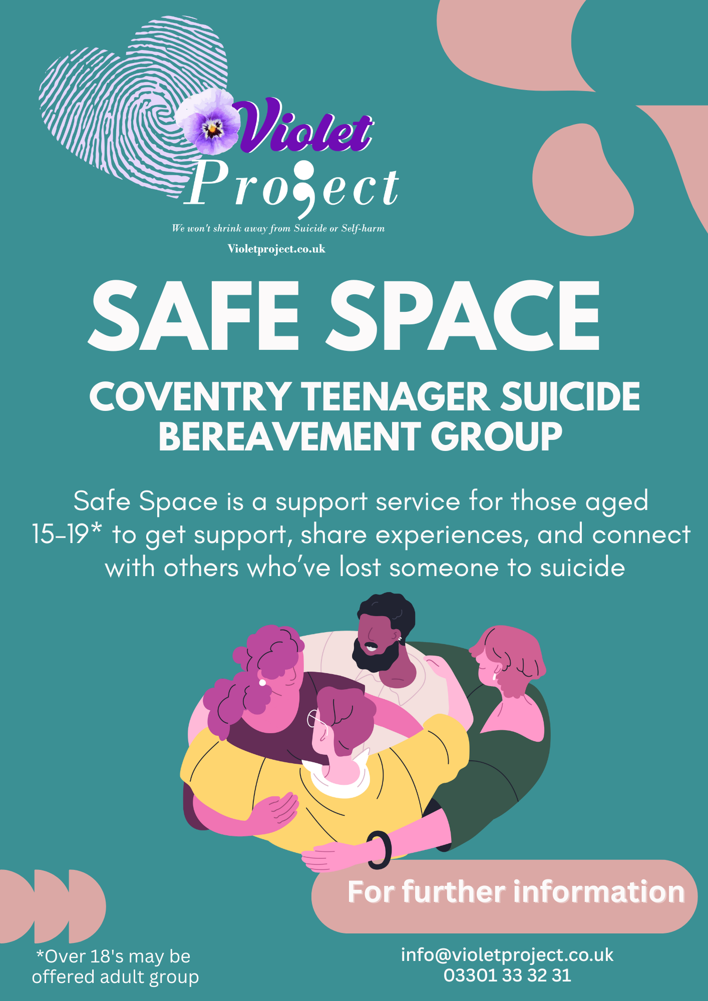 Launching Soon: Safe Space – Sitting with GriefA Peer Support Group for Young People Bereaved by Suicide The Violet Project CIO is introducing a new initiative in Coventry: Safe Space – Sitting with Grief, a peer support group designed for 15–19-year-olds who have lost someone to suicide. We understand that traditional counselling isn’t always the right fit immediately after such a loss. This group offers an alternative—a safe, inclusive environment to share experiences and begin to make sense of grief alongside others who truly understand. About the Group - Location: CV1 3BY, Coventry (details provided upon acceptance)
